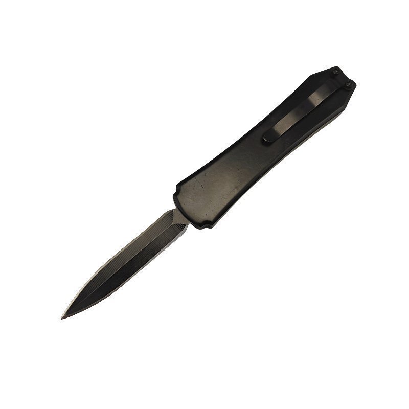 3.25″ Closed End, 5.25″ Overall, Mini OTF Knife. Stainless steel blade, black aluminum handle with clip.